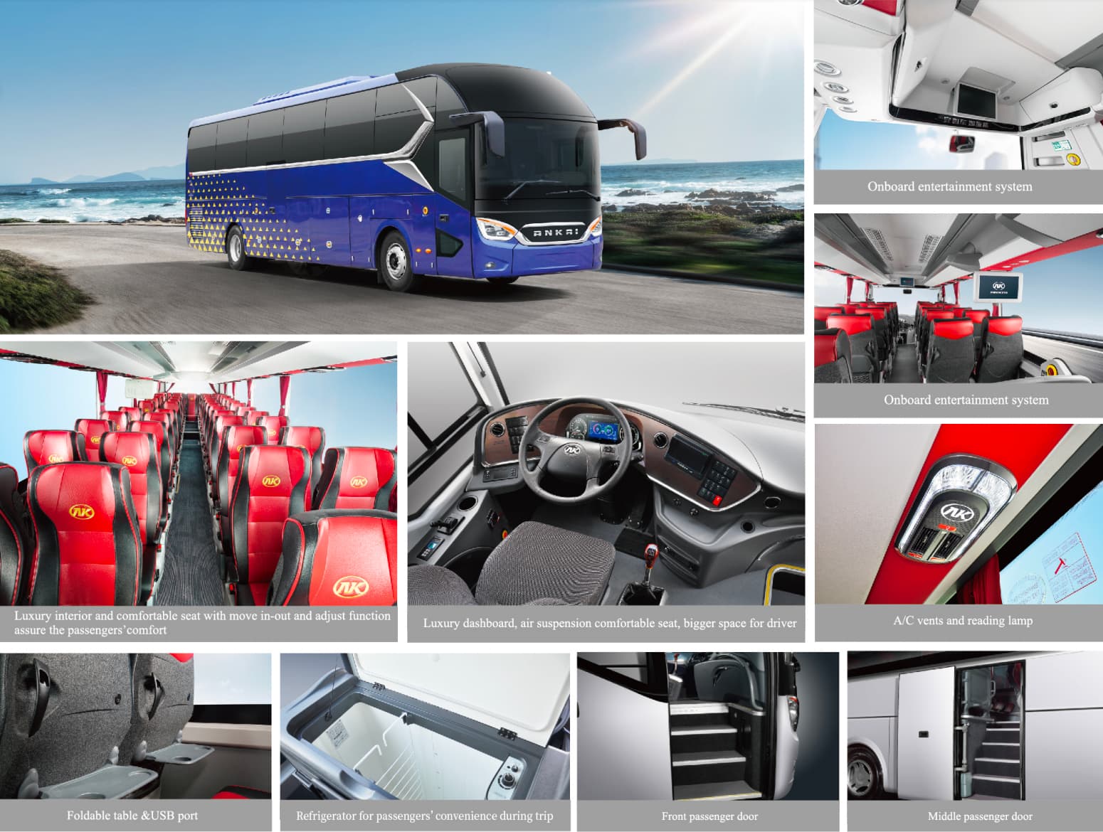 Os ônibus da Série A da Ankai — incluindo o modelo principal A12 e o compacto A6 — foram projetados para turismo de longa distância, viagens de negócios e transporte de passageiros de alto padrão. Com design exterior moderno, assentos ergonômicos e sistemas avançados de conforto a bordo, a Série A oferece alta confiabilidade, baixos custos operacionais e qualidade de viagem excepcional. Projetada para atender aos padrões de emissão Euro V, a Série A combina segurança, luxo e durabilidade para operadores que buscam um desempenho confiável para suas frotas.
